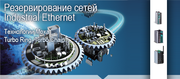 Технология кольцевого резервирования Turbo Ring была внедрена на заре развития сетей Industrial Ethernet как высокоскоростная и простая в настройке: в случае обрыва основной линии связи переключение на резервную связь составляло не более 1 секунды, а активировать функцию резервирования можно было при помощи переключения на коммутаторе. В настоящее время время восстановления связи улучшено до нескольких миллисекунд, а расширения технологии Turbo Ring позволяют строить сети, более сложные и эффективные, чем классические "кольца". Внедренная пару лет назад технология Moxa Turbo Chain позволяет строить сети практически произвольной топологии, сохраняя в них минимальную скорость реакции на возникающие сбои.