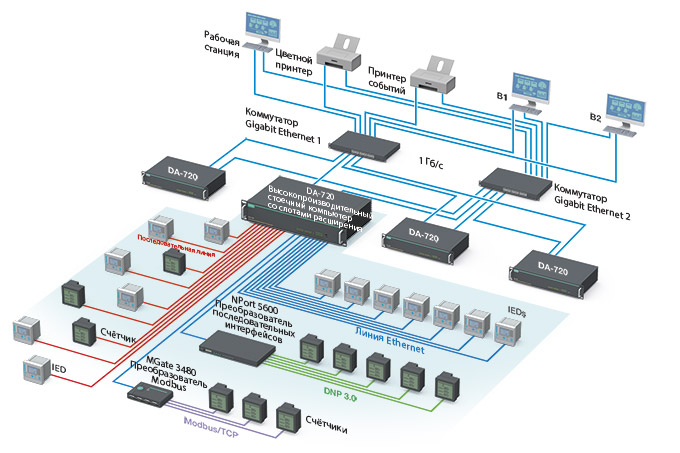 Благодаря своей высокой производительности, он может снизить нагрузку на SCADA-систему. Расширяемое число последовательных интерфейсов на компьютере DA-720 облегчают подключение к интеллектуальным электронным устройствам (IED) с интерфейсами RS-232/422/485, большое количество портов Gigabit Ethernet позволяют подключать интеллектуальные Ethernet-устройства к сети подстанции, а поддержка технологий резервирования PRP/HSR обеспечивает высокую степень доступности сети на подстанции.