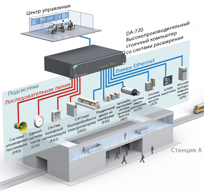 Системам контроля и управления и на станции (ISCS) и за ее пределами необходим мощный коммуникационный процессор для управления локальной SCADA-системой, а также для контроля за такими системами, как тяговая подстанция или помещение релейного щита. Компьютер DA-720, соответствующий стандарту EN 50121-4, обеспечивает стабильную и надежную работу системы в задачах железнодорожной автоматизации. Его расширяемые последовательные интерфейсы и 14 портов Gigabit Ethernet облегчают объединение подсистем, таких как AFC, PAS, PSD и FAS, в одну систему.