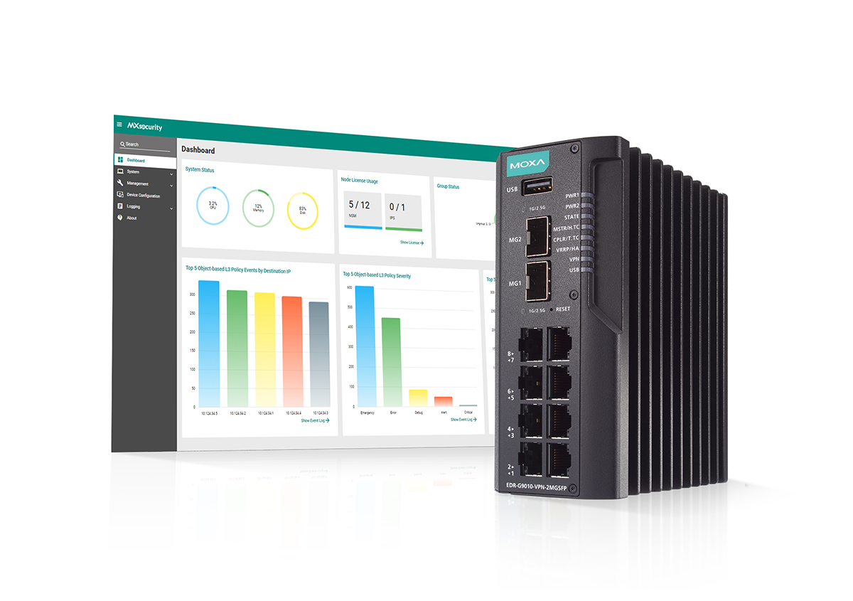 Маршрутизаторы серии EDR-G9010 имеют встроенный управляемый коммутатор и поддерживают функционал Firewall, NAT, VPN. С появлением поддержки IDS / IPS данное устройство стало полноценным межсетевым экраном нового поколения, оснащенным функциями обнаружения и предотвращения угроз для дополнительной защиты от кибератак критически важной инфраструктуры сети. А благодаря специализированному ПО MXsecurity обеспечивается видимость киберугроз в режиме реального времени, а также появляется возможность централизованного управления маршрутизаторами серии EDR-G9010.