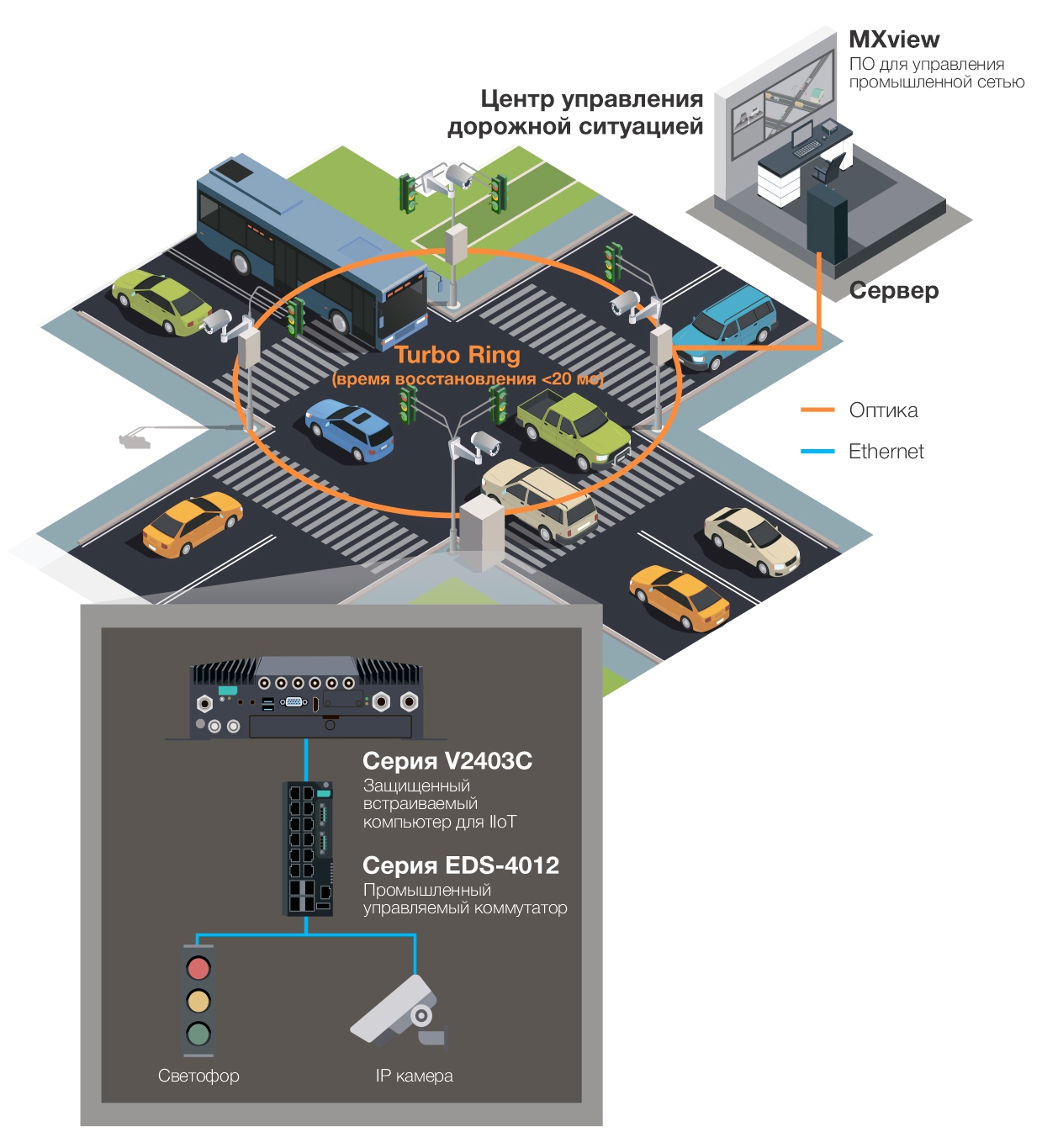 Для организации стабильной связи в интеллектуальных транспортных системах мы советуем использовать надежное промышленное оборудование Moxa. Высокопроизводительные компьютеры серии V2403C могут быть установлены в придорожных шкафах, ведь они отлично подойдут для сбора данных с датчиков и изображений с камер видеонаблюдения. А все собранные данные можно надежно передать на сервер в режиме реального времени по сети, которую можно развернуть с помощью коммутаторов серии EDS-4012. Технологии резервирования Turbo Ring и Turbo Chain с временем восстановления менее 20 мс и поддержка популярных протоколов резервирования STP/RSTP/MSTP помогут построить надежную сеть.