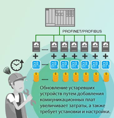 Замена устройств на новые увеличивает затраты на оборудованиеЧтобы подключить устаревшие устройства к сети PROFINET или PROFIBUS, на устройствах можно установить коммуникационные платы для прямой связи через PROFINET или PROFIBUS. Но вариант это дорогостоящий, особенно в больших сетях, где необходимо обновлять сотни и тысячи устройств. Более того, еще одна проблема заключается в ограниченном количестве адресов PROFIBUS slave ID, которые могут быть подключены к ПЛК. |