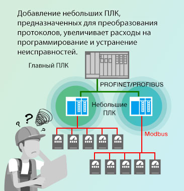 Добавление небольших ПЛК требует увеличения расходов на техническое обслуживаниДобавление небольших ПЛК между главным ПЛК и устаревшими устройствами для преобразования протоколов – еще одна возможность подключения устройств к сети PROFINET или PROFIBUS. Однако такой сети требуются высококвалифицированные специалисты для программирования и устранения неполадок. Часто инженеры не знакомы со всеми протоколами и тратят много времени, чтобы найти проблему, в то время как в системе случается простой. |