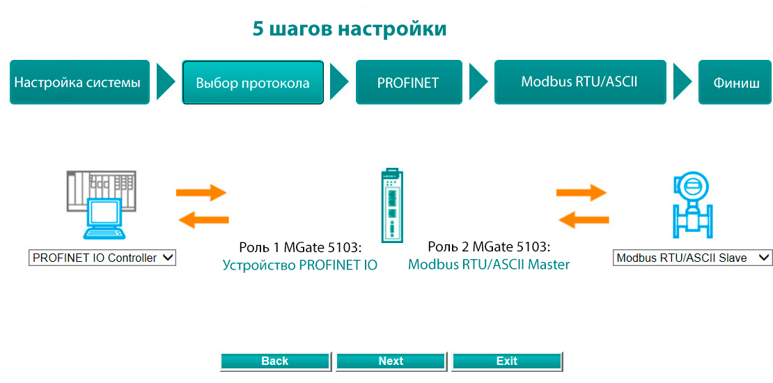 Преобразователи протоколов Moxa имеют удобный интерфейс, который позволяет пользователю быстро настроить преобразование для большинства задач, предотвращая необходимость выполнять подробные настройки параметров один за другим. С помощью мастера настройки можно легко получить доступ к режимам преобразования протоколов и завершить настройку за пять шагов.