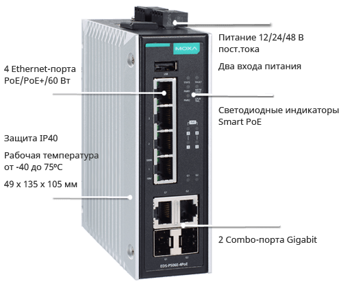 Недавно выпущенные коммутаторы серии EDS-P506E-4PoE с 2 портамиGigabit и 4 портами Fast Ethernet, благодаря технологии SmartPoE, обеспечивают до 60 Вт на каждый PoE-порт, с общей мощностью 180 Вт, высоким уровнем безопасности и интеллектуальным управлением питанием устройств по PoE для бесперебойной передачи данных и подачи питания с помощью Ethernet-линии даже в условиях электромагнитных помех.
