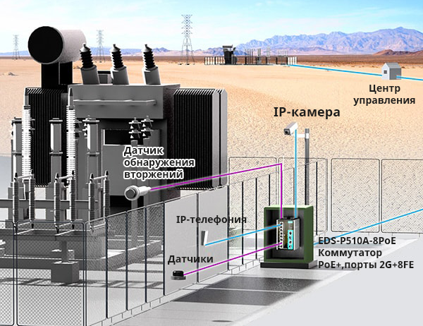 Для обеспечения безопасности доступа к каждой подстанции и передачи данных в центр управления были установлены два типа коммутаторов PoE+: IKS-6728A-8PoE (порты 24+4G) и EDS-P510A-8PoE (порты 2G+8x10/100). Коммутаторы имеют портыEthernet с выдаваемой мощностью до 36 Вт (24 и 8 портов соответственно) для обеспечения питания, необходимого для IP-камер, контроллеров доступа к дверям и оборудования IP-телефонии, и корпус, выдерживающий суровые условияработы в пустыне.
