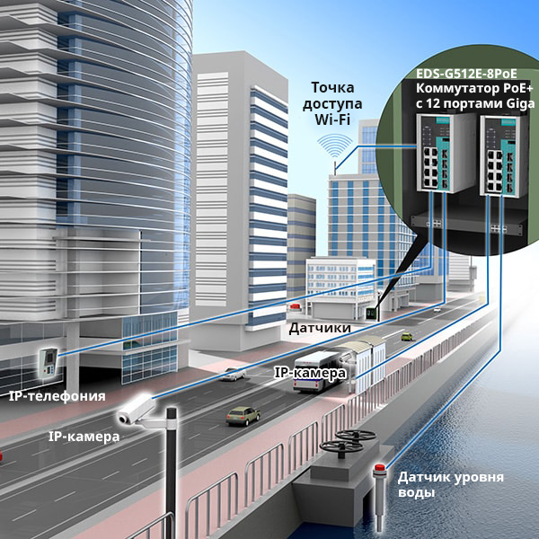 Для создания городской сети использовались 12-портовые коммутаторы Gigabit Ethernet EDS-G512E-8PoE для сбора разных типов данных и питания различных полевых устройств, установленных на улице.