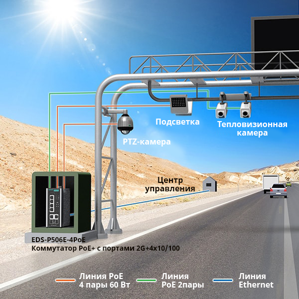 Коммутаторы серии EDS-P506E-4PoE (2 порта Gigabit и 4 порта Fast Ethernet) были использованы в данной системе, поскольку могут обеспечить до 60 Вт на линию PoE, что дает необходимую мощность для управления панорамированием, наклоном, масштабированием и фокусировкой камер. Коммутатор EDS-P506E-4PoE, благодаря 4 портам PoE+ и их общей мощности 180 Вт, может одновременно подавать питание на ИК-камеры и на периферийные устройства подсветки.