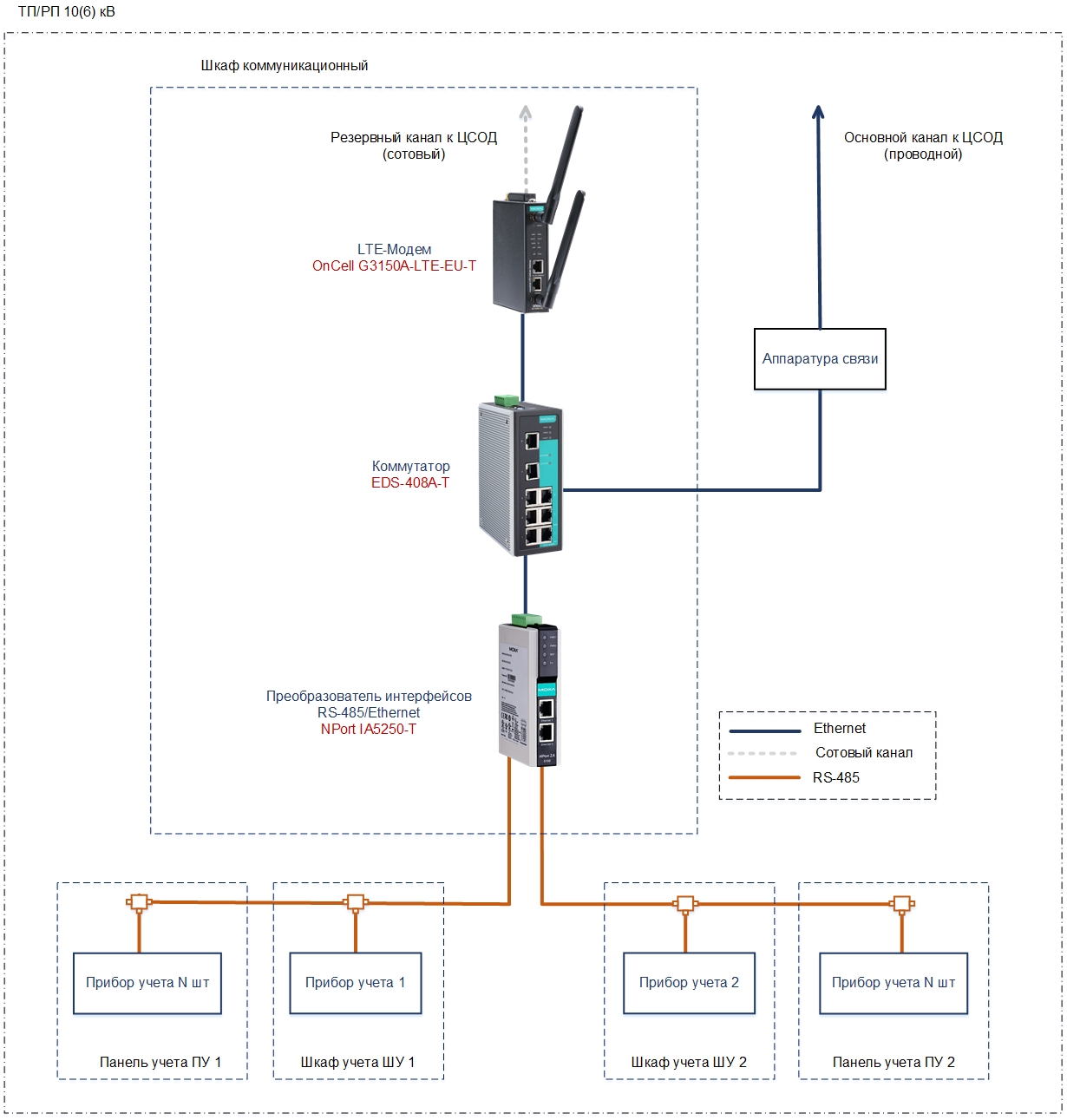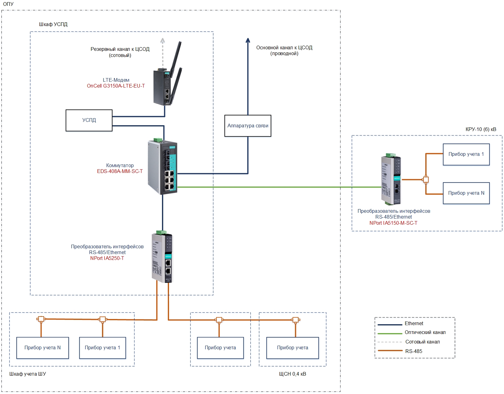 Проводные каналы связи, организованные через коммутаторы серии EDS-400A, являются основными. В случае возникновения обрыва соединений, данные передаются по резервным сотовым каналам через модемы OnCell G3000. Преобразователи интерфейсов серии NPort IA-5000 осуществляют интеграцию счетчиков с последовательными интерфейсами RS-485 в единую сеть Ethernet.