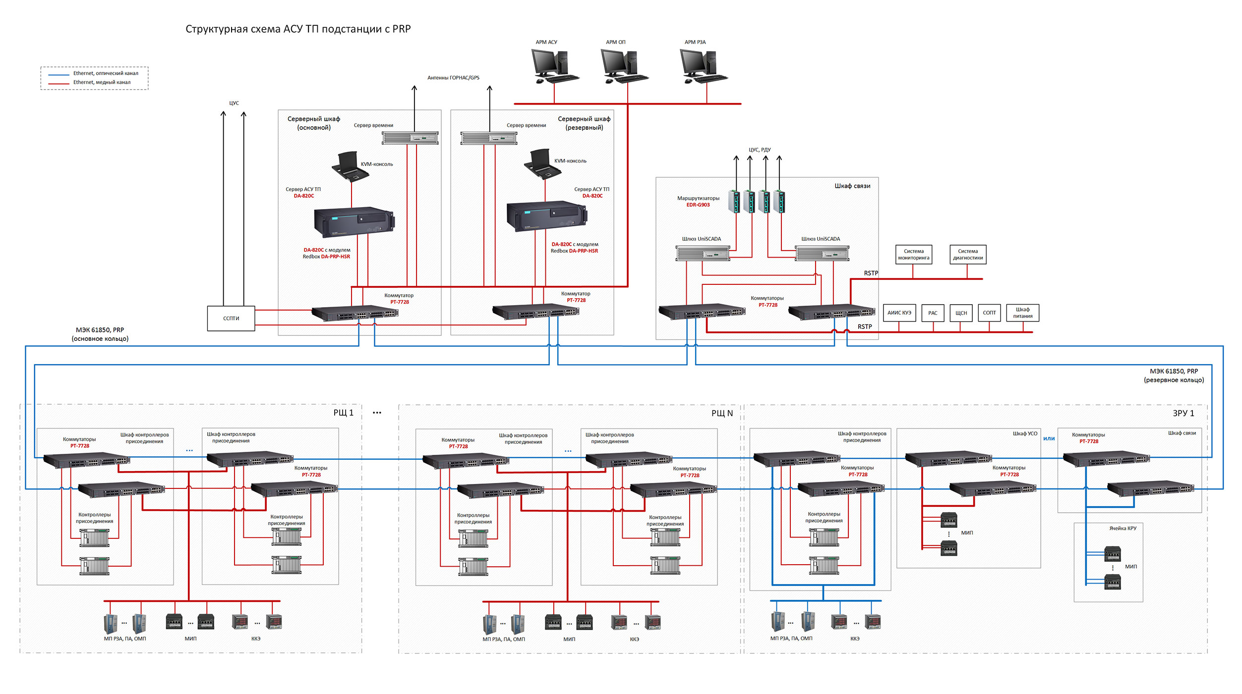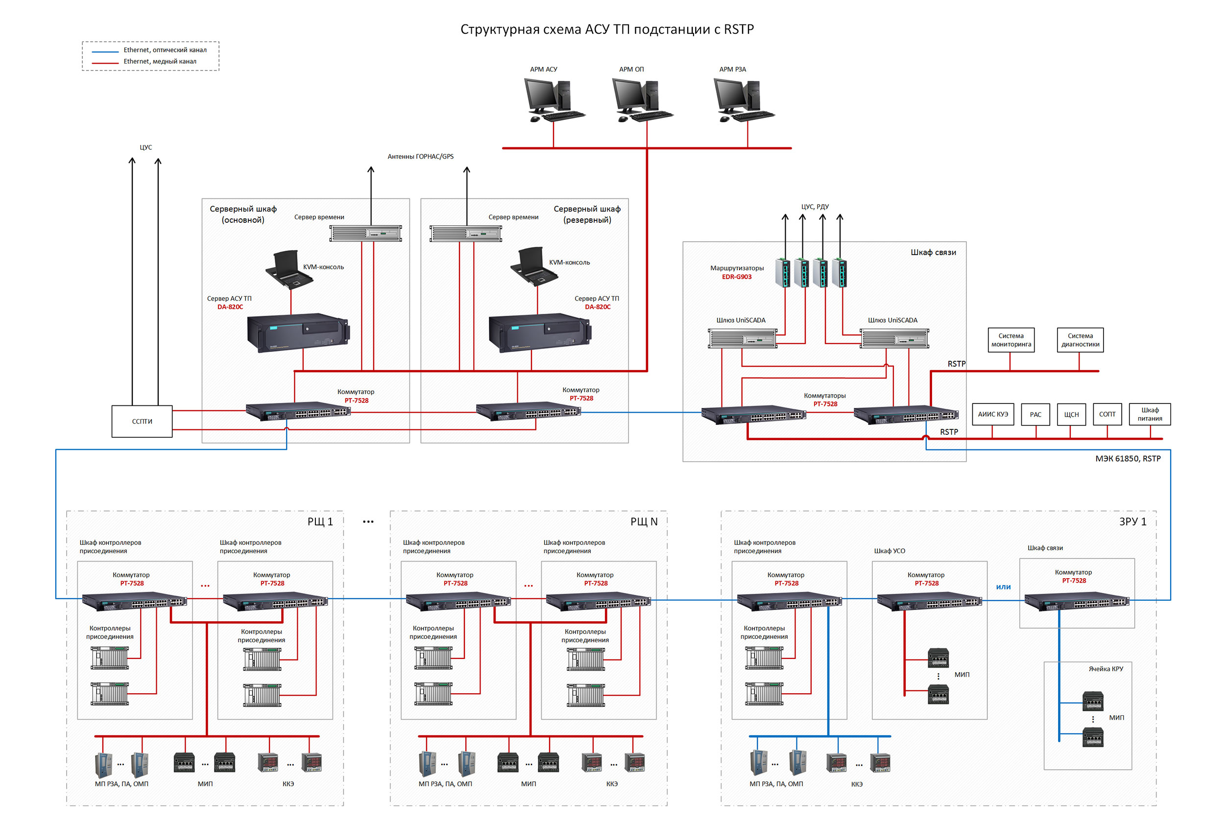 1. Структурная схема АСУ ТП подстанций с резервированием RSTP (I архитектура, без Goose и SV).