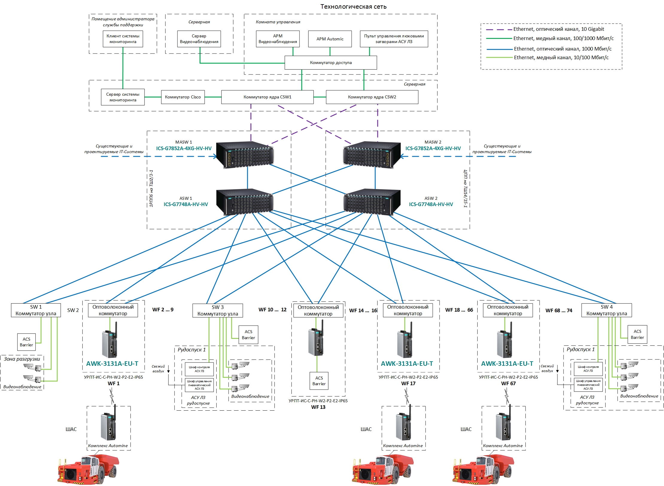 Сеть передачи данных представляет собой многоуровневую систему, построенную по топологии «звезда» с резервированием каждой единицы коммуникационного оборудования. Wi-Fi точки доступа, расположенные в выработках, обеспечивают непрерывное покрытие беспроводной сетью всей рабочей зоны автономных СДО и объединяют эти зоны в единую сеть.