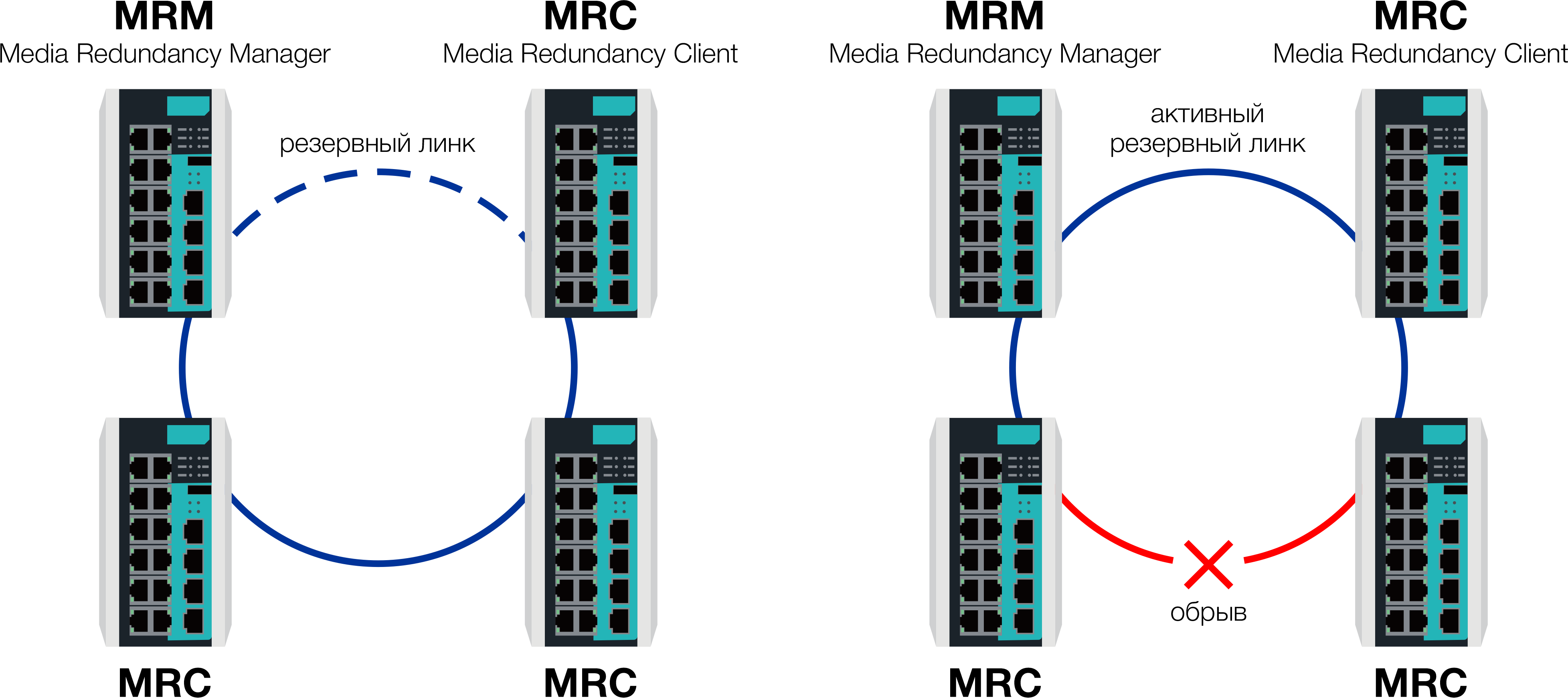 Один коммутатор в MRP кольце должен иметь роль MRM (Media Redundancy Manager), так называемый “мастер кольца”. Именно этот коммутатор будет контролировать жизнеспособность топологии. В случае обрыва кольца он активирует резервный линк и сообщит об этом остальным коммутаторам с ролью MRC (Media Redundancy Client), чтобы те начали слать трафик по новому пути.