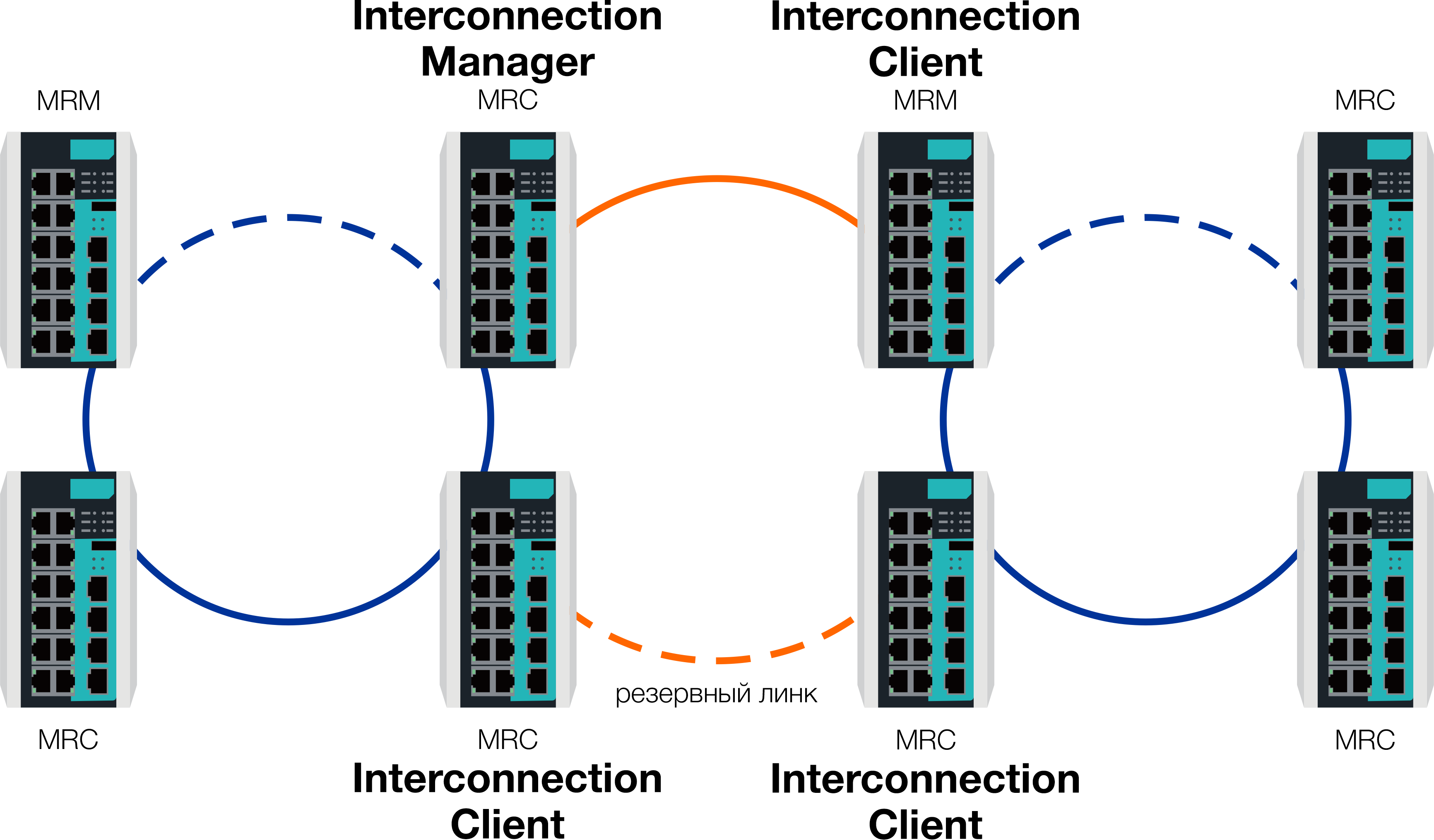 Два MRP кольца можно соединить между собой двумя линками, сделав более сложную топологию. Сделать это можно с помощью функционала Interconnection. Для этого необходимо выбрать четыре коммутатора, которые будут участвовать в Interconnection группе - два в одном кольце и два в другом. При этом неважно, какие роли у этих коммутаторов в главном кольце, в Interconnection есть свои роли. Необходимо определиться, кто будет в Interconnection группе менеджером - Interconnection Manager, а кто клиентом - Interconnection Client.