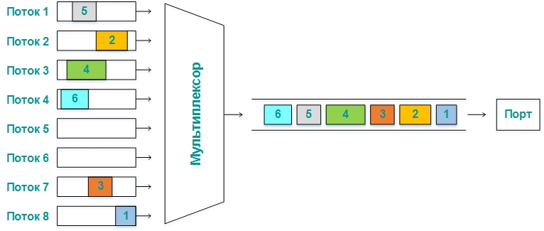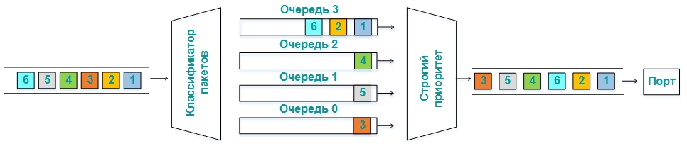 - Strict Priority queuing (PQ – строгий приоритет очереди) – Пакеты распределяются по очередям в соответствии с классом обслуживания. Первыми отправляются пакеты из очереди с наивысшим приоритетом, затем со следующей очереди и так до очереди с наименьшим приоритетом. То есть пока все пакеты из очереди с наивысшим приоритетом не будут переданы, остальные находятся в режиме ожидания.