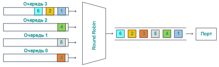- Round Robin – У каждой очереди равное время обработки пакетов. Если очередь станет пустой до того, как достигнет своего собственного времени обработки, ход обработки перейдет к следующей очереди.