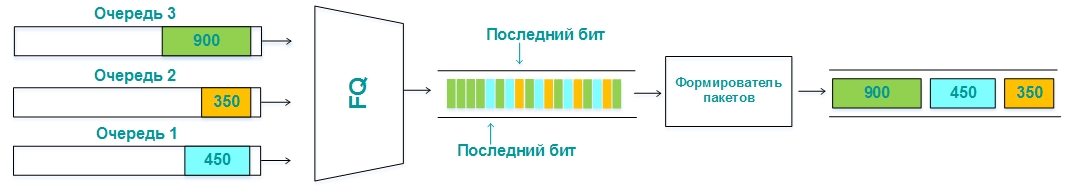 - Fair Queuing (FQ – справедливая очередь) – принцип как у Round Robin, но из каждой очереди по порядку обрабатывается одинаковый объем данных, обработка идет не по пакетам, а по определенному количеству бит.