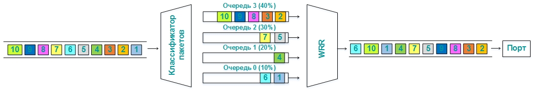 - Weighted Round Robin (WRR) – Похожа на Round Robin, но каждая очередь имеет свое собственное время обработки, при чем у разных очередей оно разное. Так время обработки очереди с наивысшим приоритетом больше, чем у последующих очередей.