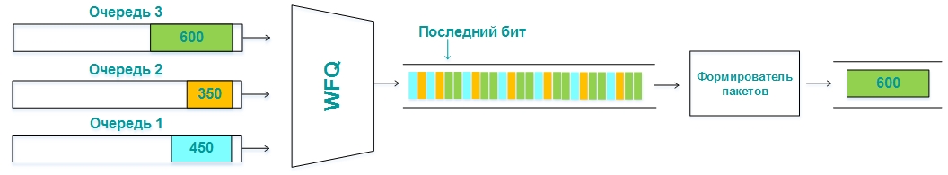 - Weighted Fair Queuing (WFQ – взвешенная справедливая очередь) – данные из каждой очереди обрабатывается последовательно, но в зависимости от приоритета очереди определяется количество передаваемого трафика за один цикл.