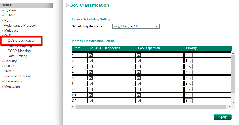 Галочками в таблице Ingress Classification Setting можно включить или отключить проверку входящего трафика по ToS, CoS или Port Priority. Также в этой таблице указывается какой приоритет присвоен трафику того или иного порта коммутатора.