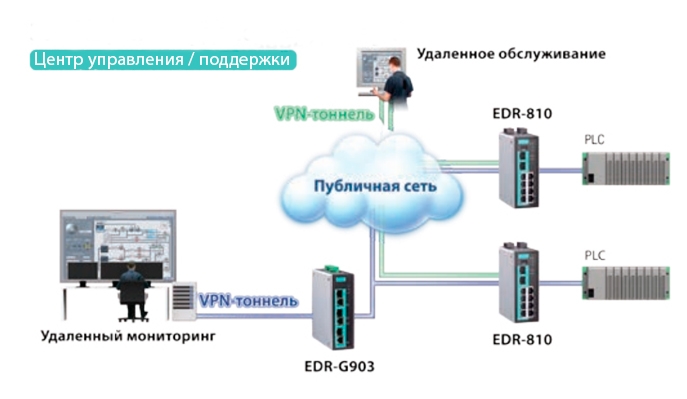 Серия промышленных маршрутизаторов MOXA EDR обеспечивает VPN-шифрование с поддержкой до 100 VPN-тоннелей для связи с удаленным центром управления; встроенные функции Firewall и NAT предотвращают неавторизованный доступ к ключевым устройствам или блокируют широковещательный шторм. Поддержка маршрутизаторами Gigabit пропускной способности позволяет развертывать высокоскоростные сети, не умаляя задачи по обеспечению безопасности, что делает устройства EDR отличным решением для любых систем, требующих построения высокопроизводительных сетей.