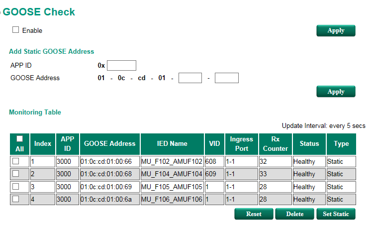 Реализованная в коммутаторе Moxa PT-G7828 функция мониторинга GOOSE-сообщений позволяют существенно упростить работу инженеров при наладке систем. Так, мониторинг позволяют отследить параметры APPID, Destination MAC, IED Name, VLAN ID, при этом отслеживается текущий статус сообщения – при пропадании сообщения из сети выдается соответствующее изменение статуса. Особо интересующие пользователя GOOSE-сообщения можно зафиксировать, чтобы отслеживать их даже после длительной потери связи. Функция мониторинга поддерживает до 100 одновременных GOOSE-сообщений. Включается данная функция через Web-интерфейс коммутатора: