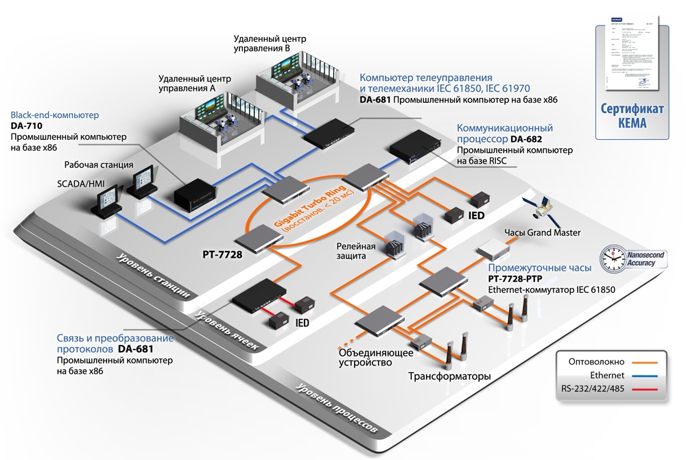 К локальным сетям и линиям связи RS-232/422/485, а также ко всему коммуникационному оборудованию на подстанциях предъявляются высокие требования по физической и функциональной надежности. Соответствие стандартам IEC 61850-3 и IEEE 1613 означает высокий уровень стойкости к электромагнитным воздействиям и обеспечение бесперебойности связи в пределах подстанции. Ethernet-коммутаторы и встраиваемые компьютеры MOXA сертифицированы по требованиям IEC 61850-3 и IEEE 1613, что гарантирует защиту от влияния различных факторов окружающей среды.