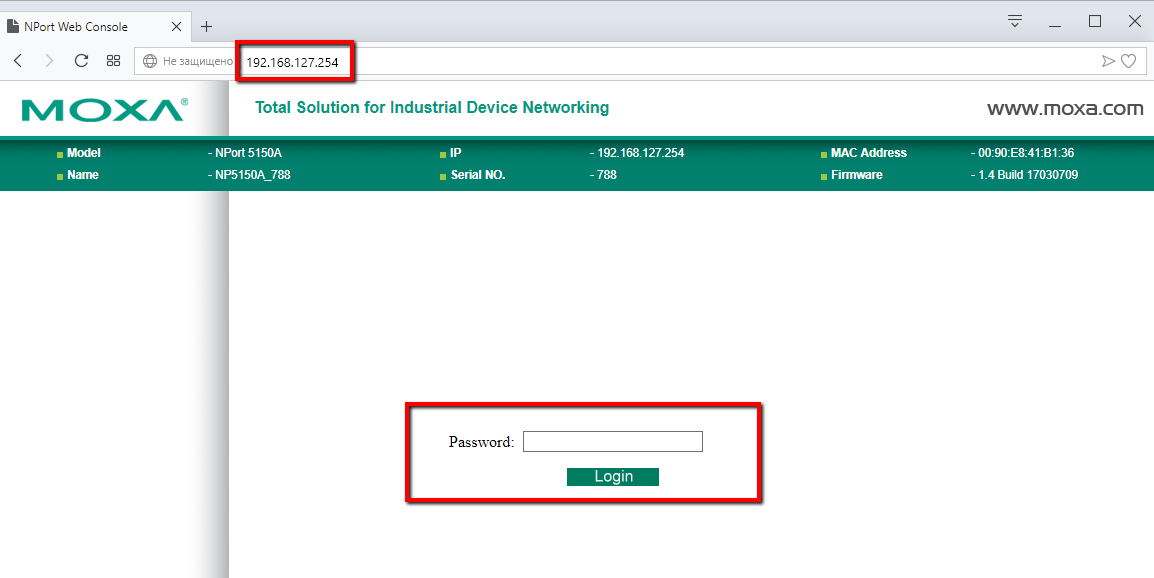 В браузере в адресной строке вводим 192.168.127.254 (ip-адрес устройства NPort по умолчанию). Вводим пароль для доступа к устройству (пароль по умолчанию moxa).