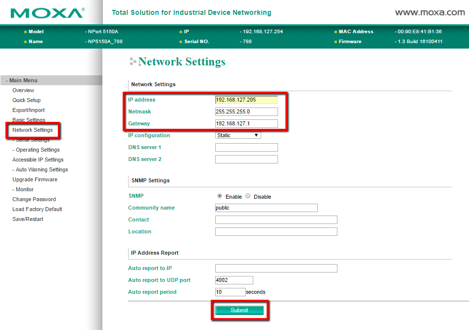 !!! Обратите внимание, что в Web-браузере теперь необходимо будет ввести новый IP-адрес устройства NPort