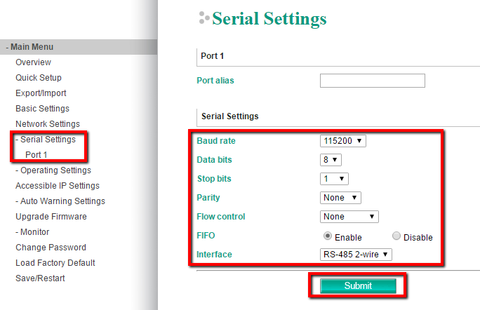 В разделе Serial Sittings указываем параметры последовательного порта аналогичные с настройками устройства, которое будет подключаться к NPort по интерфейсу RS-232/422/485.