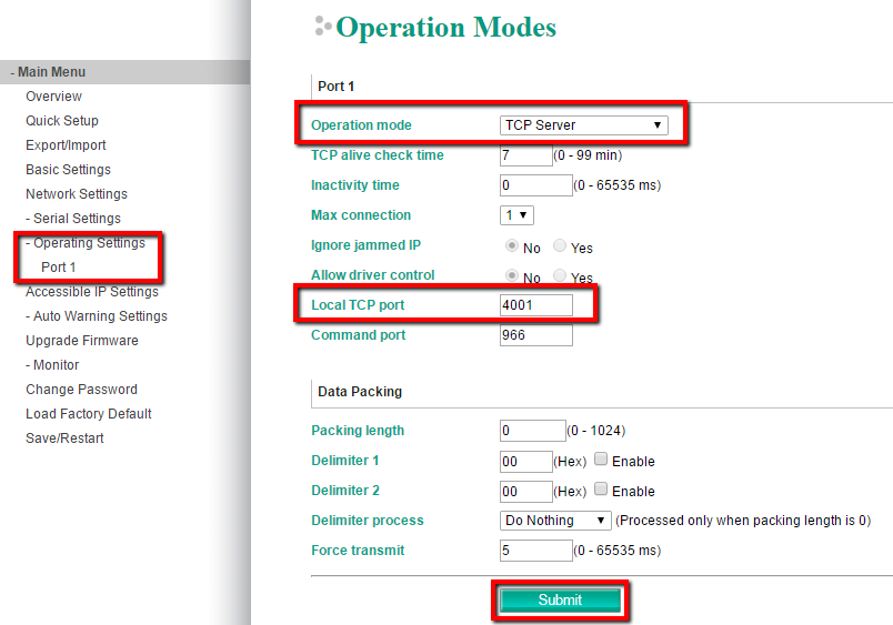 - В режиме TCP Server между устройством NPort и программным обеспечением устанавливается TCP - соединение. При обращении к конечным устройствам необходимо указать ip - адрес преобразователя NPort и ТСР - порт.
