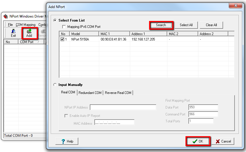 В этом режиме работы на компьютере необходимо создать виртуальный СОМ-порт. Для этого установим и запустим утилиту NPort Windows Driver Manager. В ней осуществим поиск устройства и добавим СОМ-порт.