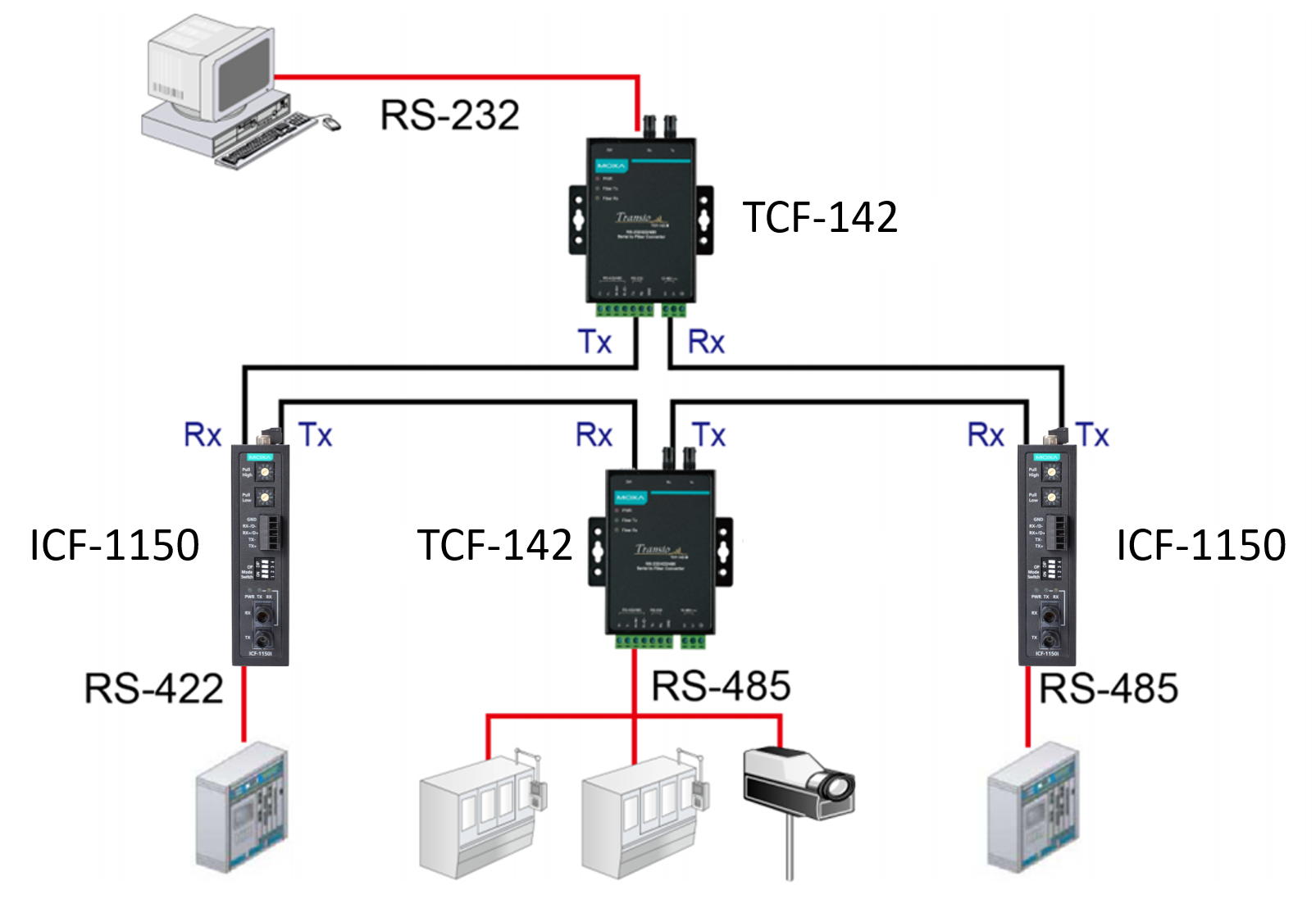 Устройства серий TCF-142 и ICF-1150 являются преобразователями последовательных интерфейсов RS-232/422/485 в оптический канал и обратно. Подобные преобразователи позволяют объединять последовательные устройства, расположенные на большом расстоянии друг от друга. Например, обвязывать датчики пожарной безопасности в единую сеть*.
