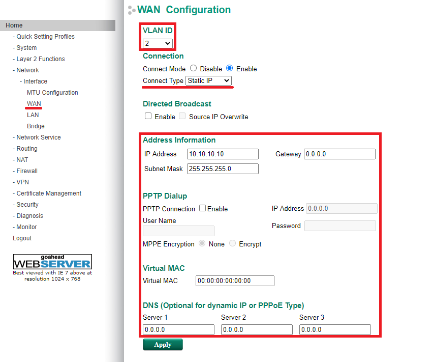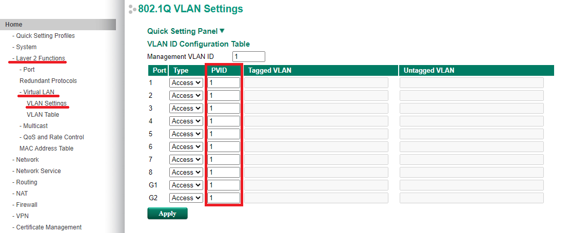 Перейдите в раздел VLAN Settings и измените номер VLAN (графа PVID) у порта, к которому будет подключена сеть провайдера (например, поставьте PVID = 2). После этого примените данные настройки (Apply):