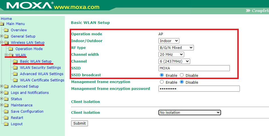 Перейдите в раздел Basic WLAN Setup, нажмите редактировать параметры сети (Edit), после чего установите параметры беспроводной сети (название сети SSID, тип беспроводного стандарта (от него зависит частота 2.4 ГГц / 5 ГГц и максимальная пропускная способность), номер и ширину беспроводного канала).