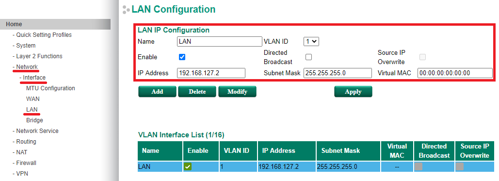 Перейдите в раздел настройки LAN интерфейсов. Там выберите номер VLAN, к которому будет подключаться все оборудование из локальной сети (по умолчанию VLAN ID 1) и задайте сетевые настройки для маршрутизатора со стороны LAN (IP адрес/маска сети из локальной подсети). После чего либо измените настройки (Modify), либо добавьте новую подсеть (Add). Для сохранения настроек нажмите Apply: