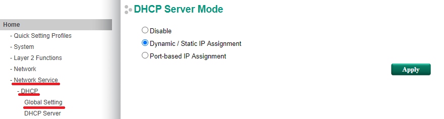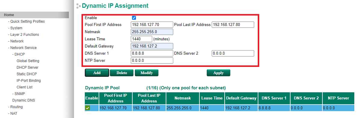 Если в локальной сети будут присутствовать устройства, которым необходимо динамически назначать локальный адрес для подключения, то необходимо включить DHCP сервер. Также необходимо прописать пул адресов, из которых будут выделяться динамические локальные адреса (он не должен пересекаться со статически назначенными адресами в локальной сети). Если устройствам локальной сети с динамическим адресом требуется доступ во внешнюю сеть, то также не забываем указать в качестве Default Gateway локальный LAN адрес маршрутизатора и DNS сервер (выданный провайдером или любой стандартный DNS, например 8.8.8.8 от Google). Добавляем (Add) и сохраняем (Apply):