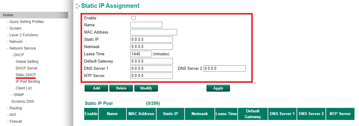 Если есть необходимость на каком-то оборудовании всегда получать по динамическому назначению один и тот же адрес, то можно сделать привязку по MAC для каждого отдельного устройства в разделе Static DHCP (добавляем отдельную запись для каждого такого устройства):