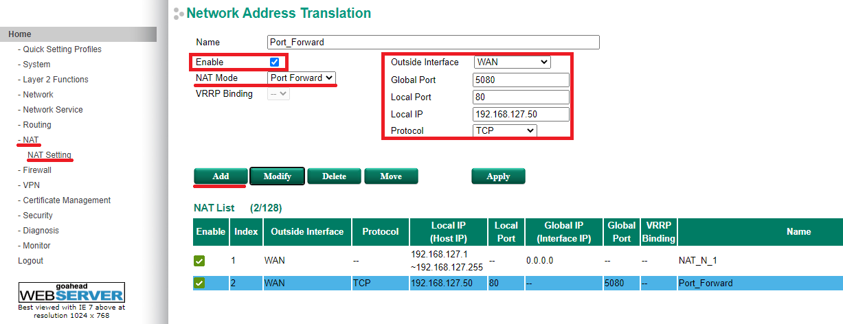 Если требуется получить доступ из внешней сети до какого-либо устройства, а также если требуется скрывать адреса локальных устройств за NAT, то выполняем настройки в разделе NAT: