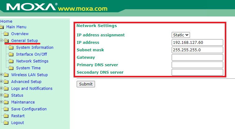 Перейдите в настройки Network Setting и задайте сетевые настройки на точках доступа из локальной подсети и примените их (Submit):