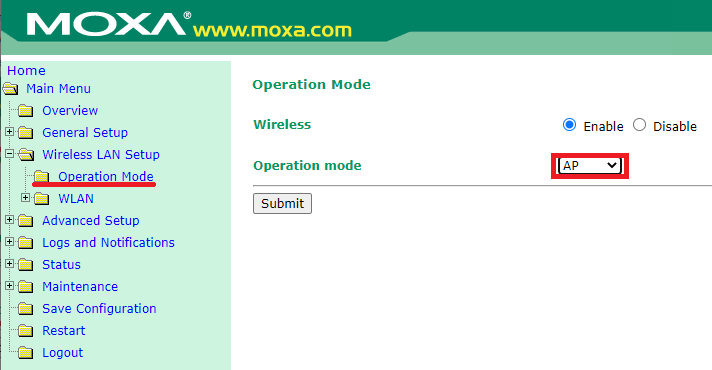 Перейдите в раздел Operation Mode и выберите режим точки доступа (AP):